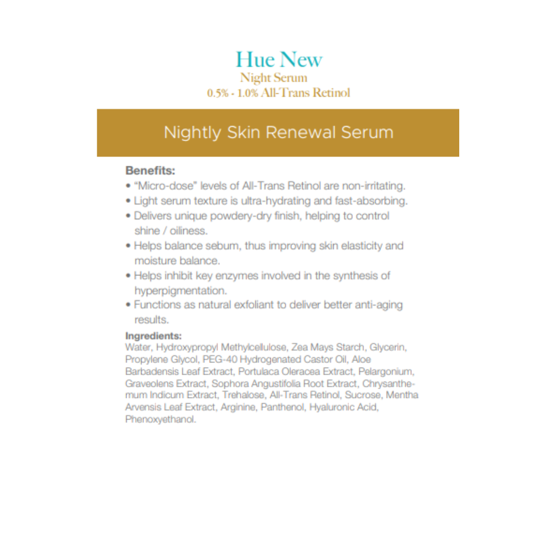 Hue New is a lightweight, hydrating night serum that carries the convenience of quick absorption, all the while leaving a unique powdery dry finish that helps to control shine and oiliness.