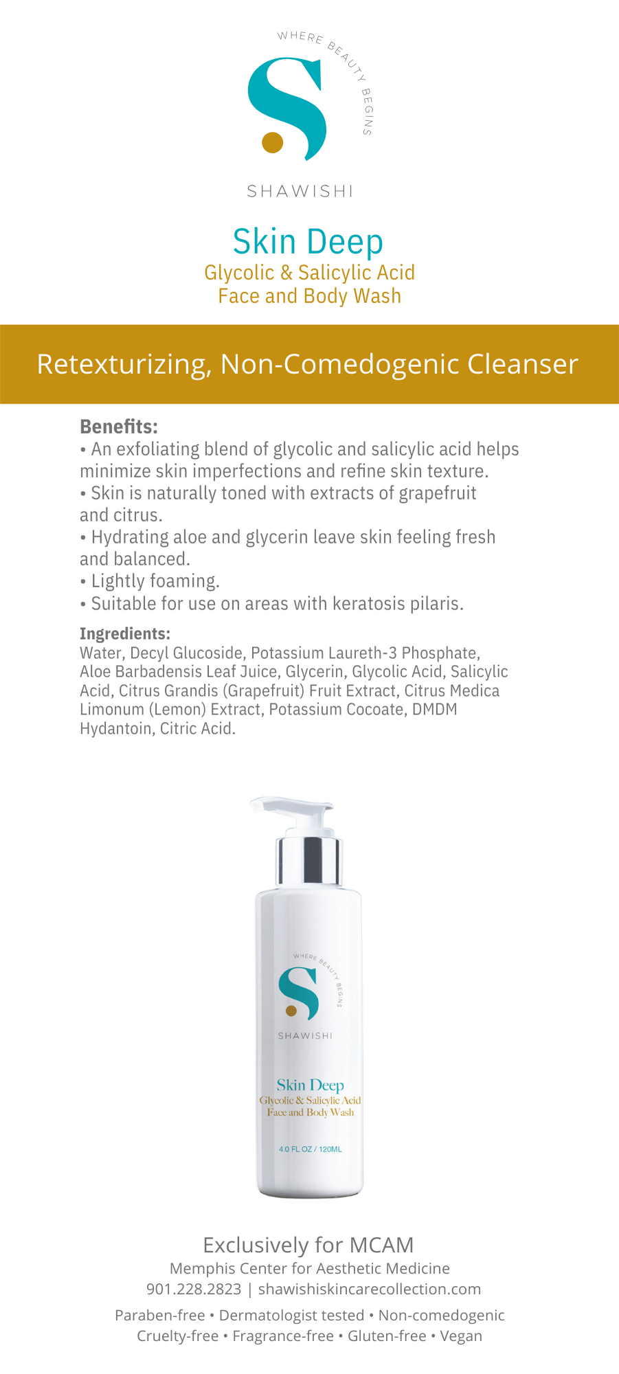 Skin Deep is your staple Glycolic and Salicylic Acid Face and Body Wash.