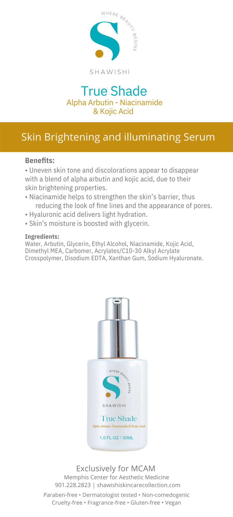 True Shade is our go-to non-Hydroquinone (non-HQ) skin brightening and illuminating serum that effortlessly minimizes the appearance of skin discoloration thanks to the formula’s powerful combo of Alpha Arbutin & Kojic Acid and Niacinamide! Three major players set to fight hyperpigmentation.